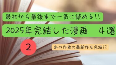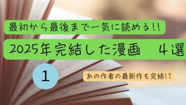 本 最初から最後まで一気に読める! 2025年完結した漫画① あの作者の最新作も完結!! あの作者の最新作も完結していた!今回は2025年に完結した漫画の中で私がおすすめする作品を4作紹介したいと思います。完結したことにより最初から最後まで一気に読む事ができるので気になっている作品があればこの機会に読んでみてはどうでしょうか。 2025.09.20 本